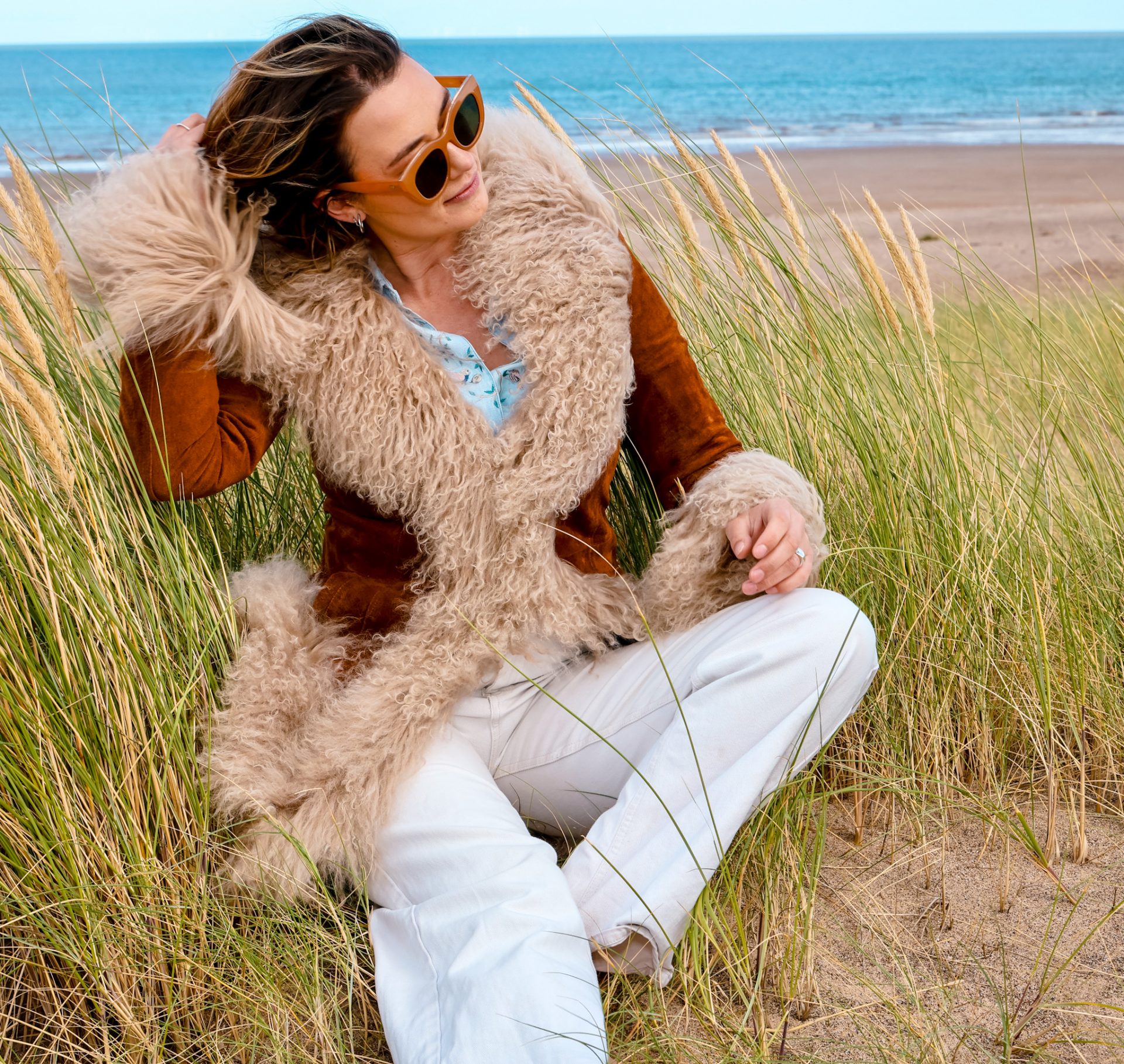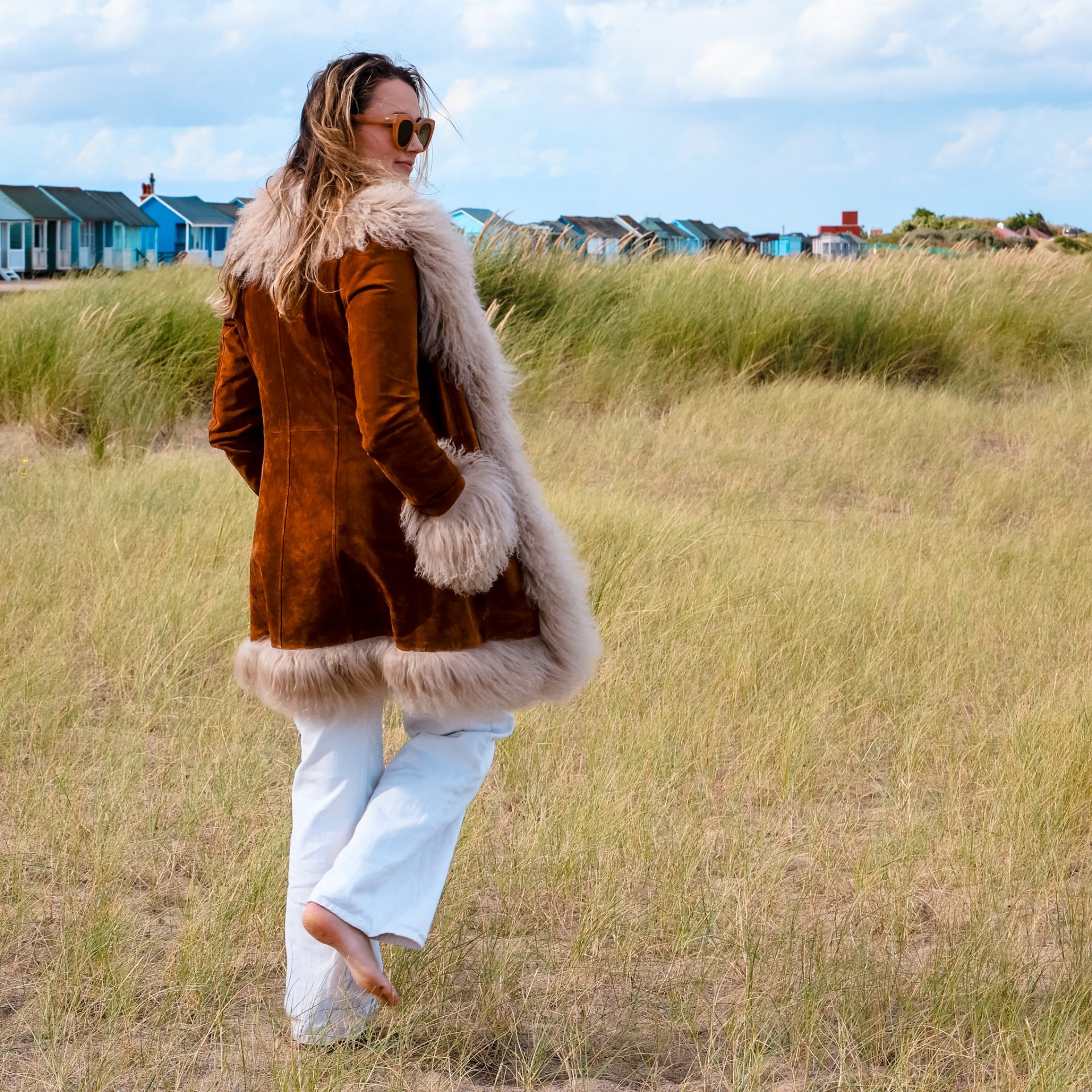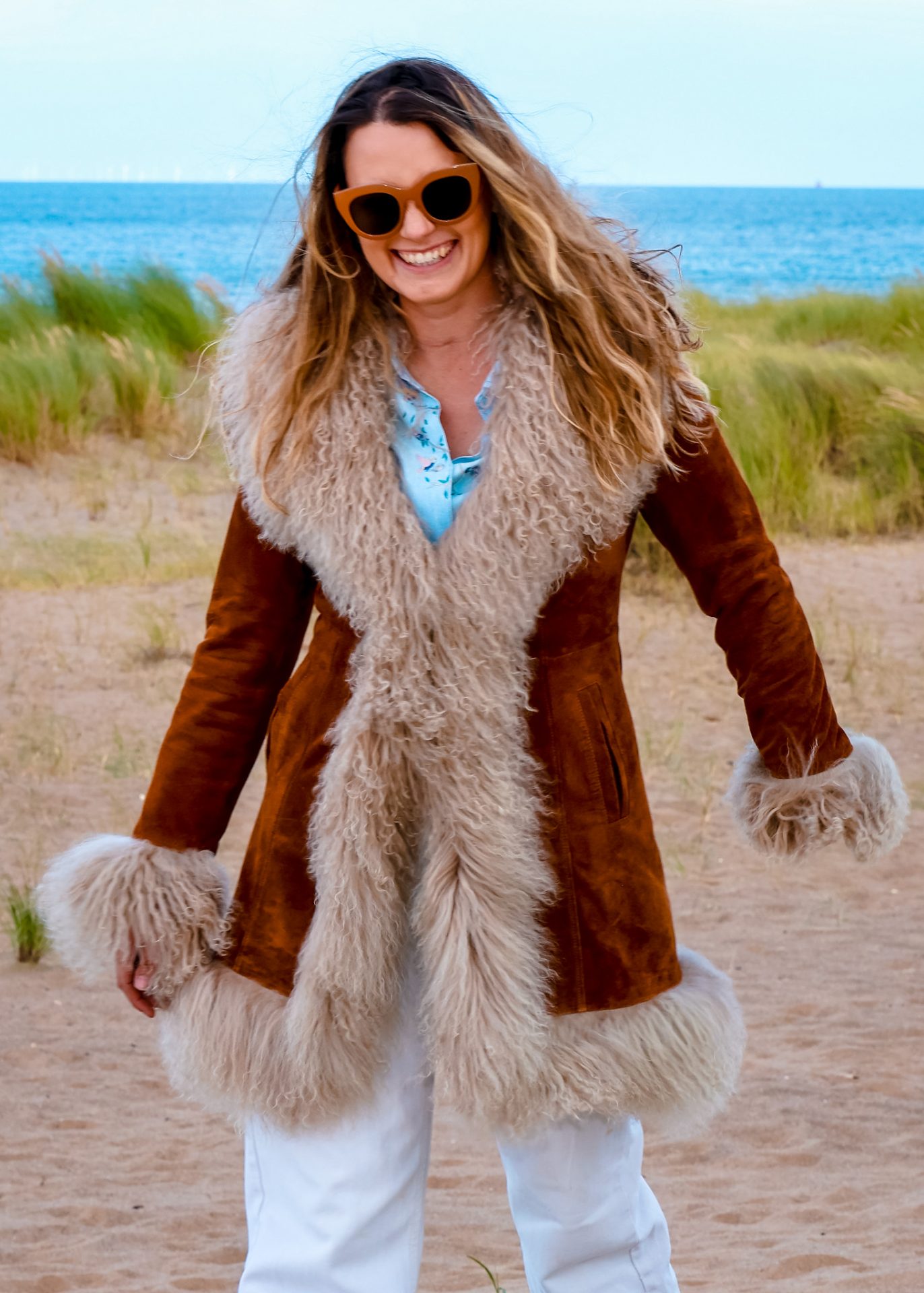 The ultimate throwback to 1970s cool. The Twiggy Coat is a bold statement in effortless style, crafted from luxe tan suede, finished with the iconic Glorious and Wild Mongolian wool trim, and complete with a silky satin lining for all-day comfort. Functional yet fabulous, it features discreet pockets for added practicality.